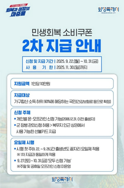 2Â÷ ¼ÒºñÄíÆù Áö±Þ¾×Àº 1Àδç 10¸¸ ¿øÀÌ´Ù. 22ÀϺÎÅÍ 10¿ù 31ÀϱîÁö ½ÅûÇÒ ¼ö ÀÖÀ¸¸ç, ½Å¿ë¡¤Ã¼Å©Ä«µå, Áö¿ªÈÆó, ¼±ºÒÄ«µå °¡¿îµ¥ ¼±ÅÃÇÒ ¼ö ÀÖ´Ù. »ç¿ë ±âÇÑÀº 11¿ù 30ÀϱîÁö´Ù.
