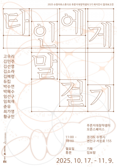 [DBSº¸µµ±¹]=¼ö¿ø¹®ÈÀç´ÜÀº ¿À´Â 10¿ù 17ÀϺÎÅÍ 11¿ù 9ÀϱîÁö ¾à 3ÁÖ°£ žµ¿ ½Ã¹Î³óÀå¿¡ ÀÚ¸®ÇÑ ¼ö¿ø¾ÆÆ®½ºÆ©µð¿À Ǫ¸¥Áö´ëâÀÛ»ùÅÍ¿¡¼ 5±â ·¹Áö´ø½Ã Âü¿©ÀÛ°¡ 13ÀÎÀÇ ¿Ã ÇÑ ÇØ ÀÛǰ Ȱµ¿ ¼º°ú¸¦ °øÀ¯ÇÏ´Â °á°úº¸°íÀü <ŸÀο¡°Ô ¸» °É±â>¸¦ °³ÃÖÇÑ´Ù.