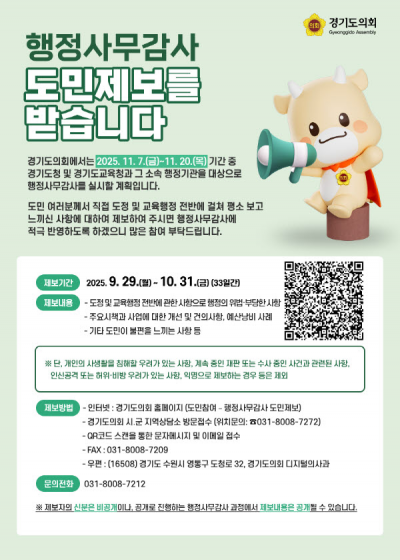 Á¦º¸ ¹æ¹ýÀº ¡â°æ±âµµÀÇȸ ȨÆäÀÌÁö(µµ¹ÎÂü¿© ¡æ ÇàÁ¤»ç¹«°¨»ç µµ¹ÎÁ¦º¸) ¿Â¶óÀÎ Á¢¼ö ¡âQRÄÚµå ½ºÄµÀ» ÅëÇÑ ¹®ÀÚ¸Þ½ÃÁö ¹× À̸ÞÀÏ(ggassembly15@gg.go.kr) Á¢¼ö ¡â°æ±âµµÀÇȸ 31°³ ½Ã¡¤±º Áö¿ª»ó´ã¼Ò ¹æ¹® Á¢¼ö ¡âÆÑ½º(031-8008-7209) ¡â¿ìÆí(°æ±âµµ ¼ö¿ø½Ã ¿µÅ뱸 µµÃ»·Î 32, °æ±âµµÀÇȸ µðÁöÅÐÀÇ»ç°ú) µî ´Ù¾çÇÏ´Ù.