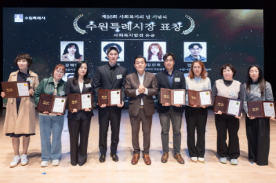 ±â³ä½ÄÀº »çȸº¹Áö À¯°ø ǥâ ¼ö¿©, ÀÌÀçÁØ ½ÃÀåÀÇ Ãà»ç, »çȸº¹Áö»ç¾÷ À±¸®¼±¾ð¹® ³¶µ¶, AI(ÀΰøÁö´É) ¹Ìµð¾î¾ÆÆ® ¿µ»ó »ó¿µ µîÀ¸·Î ÁøÇàµÆ´Ù. º¸°Çº¹ÁöºÎ Àå°ü ǥâ(1¸í), ¼ö¿ø½ÃÀå ǥâ(23¸í), ¼ö¿ø½ÃÀÇȸ ÀÇÀå ǥâ(3¸í), ¼ö¿ø½Ã»çȸº¹ÁöÇùÀÇȸÀå ǥâ(3¸í), ¼ö¿ø½Ã»çȸº¹Áö»çÇùȸÀå ǥâ(3¸í) µî »çȸº¹ÁöÀ¯°øÀÚ ÃÑ 39¸í¿¡°Ô ǥâÀ» ¼ö¿©Çß´Ù.