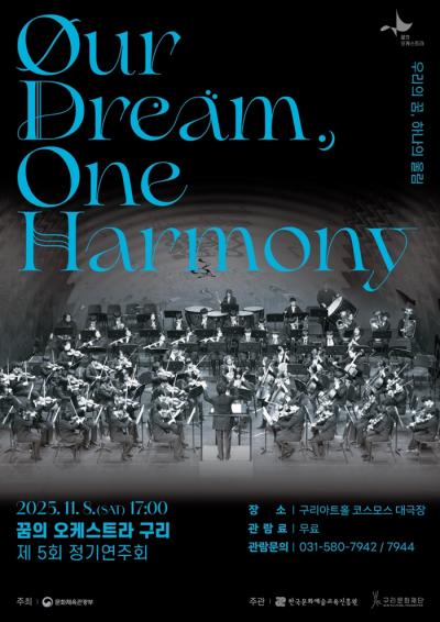¡®2025 ²ÞÀÇ ¿ÀÄɽºÆ®¶ó ±¸¸® Á¦5ȸ Á¤±â¿¬ÁÖȸ¡¯´Â 11¿ù 8ÀÏ(Åä) ¿ÀÈÄ 5½Ã, ±¸¸®¾ÆÆ®È¦ ÄÚ½º¸ð½º ´ë±ØÀå¿¡¼ °³ÃֵǸç, À̹ø °ø¿¬ÀÇ ÁÖÁ¦´Â ¡®¿ì¸®ÀÇ ²Þ, ÇϳªÀÇ ¿ï¸²¡¯ÀÌ´Ù. ´Ü¿øµéÀÇ ²Þ°ú ¿Á¤ÀÌ Çϳª·Î ¾î¿ì·¯Áö´Â ¼ø°£À» °ü°´°ú ÇÔ²² ³ª´©¸ç, À½¾ÇÀ» ÅëÇØ Èñ¸Á°ú °¨µ¿À» ÀüÇÒ ¿¹Á¤ÀÌ´Ù.