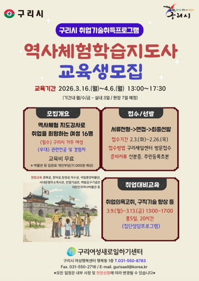 [DBSº¸µµ±¹]=±¸¸®½Ã´Â ±¸¸®»õÀϼ¾ÅÍ¿¡¼ ±¸¸®½Ã °ÅÁÖ ¿©¼ºÀ» ´ë»óÀ¸·Î ¿î¿µÇÏ´Â ¡®2026³â Ãë¾÷ ±â¼ú ÃëµæÇÁ·Î±×·¥¡¯ °¡¿îµ¥ ¿ª»ç üÇèÇнÀ Áöµµ»ç °úÁ¤ ±³À°»ýÀ» ¿À´Â 2¿ù 3ÀϺÎÅÍ ¸ðÁýÇÑ´Ù°í ¹àÇû´Ù.