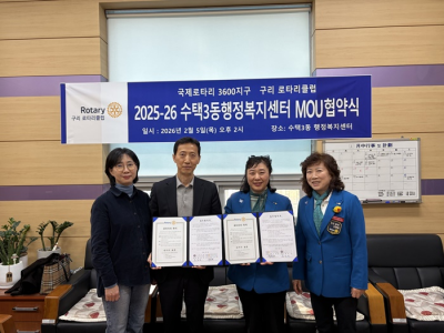 [DBSº¸µµ±¹]=±¸¸®½Ã ¼öÅÃ3µ¿ ÇàÁ¤º¹Áö¼¾ÅÍ(µ¿Àå È«Á¾¹Î)´Â Áö³ 5ÀÏ, ±¸¸®·ÎŸ¸®Å¬·´(ȸÀå °¹Ì¾Ö)°ú Áö¿ª»çȸ Ãë¾à°èÃþÀÇ º¹Áö ÁõÁø°ú ³ª´® ¹®È È®»êÀ» À§ÇÑ ¾÷¹« Çù¾àÀ» ü°áÇß´Ù°í ¹àÇû´Ù.