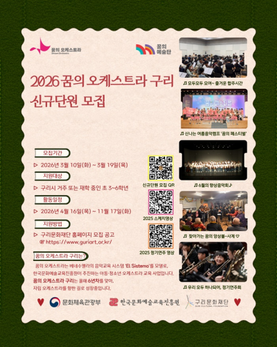 [DBSº¸µµ±¹]=(Àç)±¸¸®¹®ÈÀç´Ü(ÀÌ»çÀå ¹é°æÇö)ÀÌ 2026³â ¡®²ÞÀÇ ¿ÀÄɽºÆ®¶ó ±¸¸®¡¯¿¡ ÇÔ²²ÇÒ ½Å±Ô ´Ü¿ø°ú ±³À° °»ç¸¦ °ø°³ ¸ðÁýÇÑ´Ù. À̹ø ¸ðÁýÀ» ÅëÇØ ÃʵîÇб³ 3ÇгâºÎÅÍ 6Çгâ±îÁöÀÇ ¾Æµ¿ ¾à 10¸í°ú ºÐ¾ßº° ±³À° °»ç 13¸íÀ» ¼±¹ßÇÒ ¿¹Á¤ÀÌ´Ù.