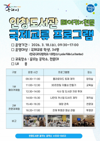 [DBSº¸µµ±¹]=±¸¸®½Ã ÀÎâµµ¼°ü ²Þ²Ù´Â °øÀÛ¼Ò´Â ¿À´Â 3¿ù 18ÀÏ, °ü³» Çб³ÀÇ ±¹Á¦±³·ù Çлç ÀÏÁ¤°ú ¿¬°èÇØ ¿Ü±¹ÀÎ Çлýµé¿¡°Ô Çѱ¹ µµ¼°üÀÇ Æ¯ÈµÈ ¸ÞÀÌÄ¿ ¹®È¿Í õ¹® °üÃø Ȱµ¿À» ¼Ò°³ÇÏ´Â ¡®¸ÞÀÌÄ¿¡¿Ãµ¹® ±¹Á¦±³·ù ÇÁ·Î±×·¥¡¯À» ¿î¿µÇÑ´Ù.