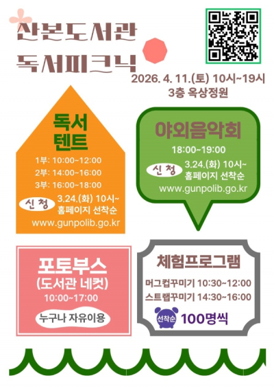 µ¶¼ÅÙÆ®¿Í ¾ß¿ÜÀ½¾Çȸ´Â ±ºÆ÷½Ãµµ¼°ü ´©¸®Áý(https://www.gunpolib.go.kr)À» ÅëÇØ 3¿ù 24ÀÏ(È)ºÎÅÍ ¼±Âø¼øÀ¸·Î ½ÅûÇÒ ¼ö ÀÖÀ¸¸ç, Æ÷ÅäºÎ½º¿Í üÇèÇÁ·Î±×·¥Àº Çà»ç ´çÀÏ µµ¼°ü ¹æ¹® ½Ã¹Î ´©±¸³ª ÀÚÀ¯·Ó°Ô Âü¿©ÇÒ ¼ö ÀÖ´Ù.